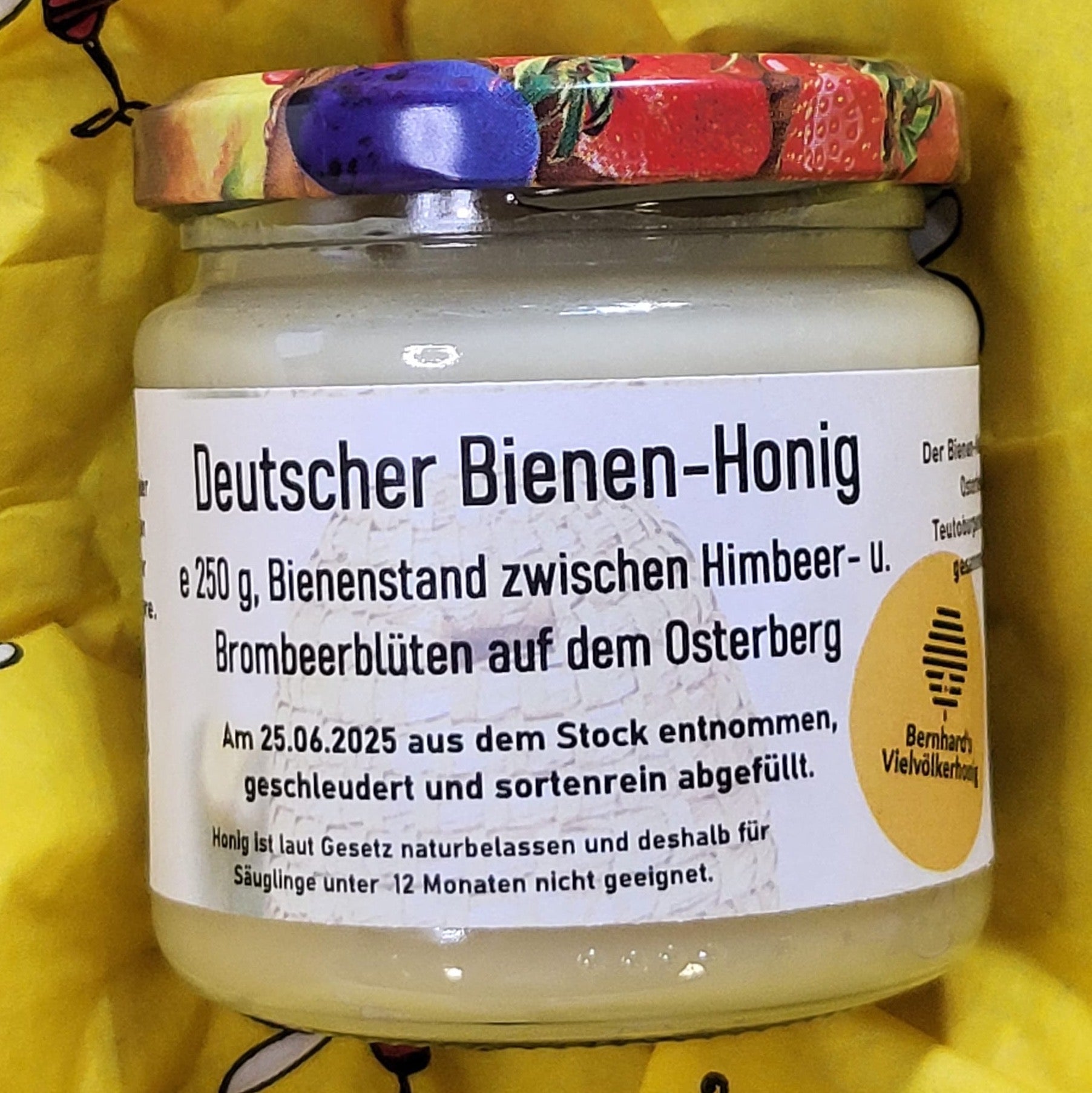 Naturreiner Bienenhonig vom Bienenstand zwischen Brombeer- und Himbeerblüten auf dem Osterberg 250g